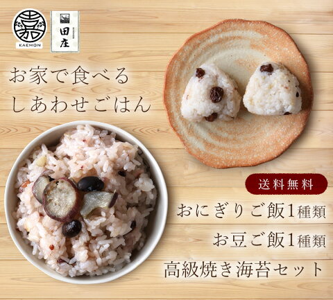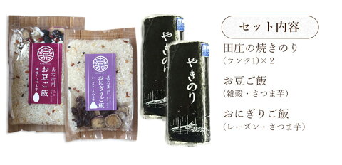 ◆商品名 田庄やきのり ランク1 (全型10枚入・2パック) & 米屋かたぎり お豆ごはん(雑穀・さつま芋) & おにぎりごはん(レーズン・さつま芋) 各1 セット (計4点) ◆商品説明 ■田庄やきのり (全型10枚入・2パック)■ 内容:全型10枚(パック)× 2 袋サイズ(mm):縦 230 × 横 110 × 奥行 240 パリッとした食感、香り豊かな風味、本物の味、まさに絶品! 高級寿司屋でも使用されているこだわりのやきのり、 専門店でしか取り扱いがないので希少価値の高い逸品です。